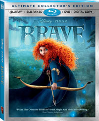 Boardwalk Empire, it was strange to hear Margaret's voice emerging from an animated character.) Brave certainly isn't Pixar's worst effort -- that honor still goes to Wall-E -- (and I like the fact that they've gone back to a shorter running time), but it certainly doesn't live up to the high standards created by their early hits.Brave really could have used a sassy side-kick on Blu-ray Disc courtesy of Walt Disney Studios Home Entertainment. The film has been letterboxed at 2.35:1 and the Disc contains an AVC 1080p HD transfer which runs at an average of 25 Mbps. As one would expect, the transfer (which I assume is digital-to-digital) look gorgeous. The image is sharp and clear, showing no grain and no defects from the source material. The colors look fantastic, most notably the greens of the landscape and the fiery red of Merida's hair. The image is never overly dark or bright and the night-time scenes show nice looking deep blacks. The detail to the image is amazing, as we can see all of the finesse of the animation, and the image has a great deal of depth, even in the 2D version. The Disc carries a Dolby TrueHD 7.1 audio track which runs at 48 kHz and an average of 7.0 Mbps. The track provides clear dialogue and sound effects. I've never seen audio bitrates as high as those offered here, so some engineer really went to town on this track. The stereo and surround sound effects are abundant, and these really help to bring the film to life. We get distinct and individual sounds in the front and rear channels, and we can easily make out when the effects move from side-to-side or from front-to-rear. The subwoofer effects come to life during the action sequences, lending a wall-shaking rumble to the proceedings without overpowering the other sounds.