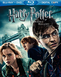 The Harry Potter and the Deathly Hallows Part 1 Blu-ray Disc contains several extras. Disc 1 offers "Maximum Movie Mode" which is hosted by Jason Isaacs -- Lucius Malfoy from the films. This Picture-in-Picture mode provide behind-the-scenes footage and interviews, as well as detailed information on the film's production and Harry Potter lore. These "Focus Points" can also be viewed separate from this mode in six separate featurettes which run a total of 19 minutes. These place a lot of focus on visual FX and special effects makeup. The remainder of the extras are found on Disc 2. "The Seven Harrys" (5 minutes) examines the difficulties in shooting the scene in which multiple Harry's appear in order to confuse the enemy. "On the Green with Rupert, Tom, Oliver, and James" (14 minutes) shows four of the actors taking a golfing vacation. Why do I care about this? We see how Harry, Ron, and Hermione handles all of the chases through the woods in "Dan, Rupert and Emma's Running Competition" (3 minutes). "Codric's Hollow/The Harry and Nagini Battle" (6 minutes) takes on onto the set to see how an entire village was built indoors, which is then followed by a look at the next scene which has a CG fight. We see how "The Frozen Lake" (4 minutes) was created in a tank in a studio. The Disc contains eight DELETED SCENES which run about 11 minutes. Other than two short scenes between Harry and the Dursleys, these are pretty pointless. "Behind the Soundtrack" (4 minutes) shows composer Alexandre Desplat at work with his orchestra.