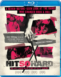 The Hit So Hard: The Life & Near Death of Patty Schemel Blu-ray Disc contains a few extras. We begin with an AUDIO COMMENTARY from Director P. David Ebersole and Patty Schemel. "Patty's Home Movies" (64 minutes) contains 24 segments which Schemel shot on Hole's world tour, as it shows the band in Australia, Japan, Paris, and several U.S. cities. Ian Astbury of The Cult makes an appearance here, and we get an extended look at the band rehearsing for MTV Unplugged, where Courtney Love plays with her daughter on her lap. "Q&A at the Museum of Modern Art with Hole" (10 minutes) takes place after a screening of the film where Director P. David Ebersole and Schemel, Love, and others appear on-stage. The audio here isn't very good. "Hole Makes a Fan a Star" (7 minutes) is an interview with the woman who is featured in the film in a scene where Courtney Love plucks someone from the audience and teaches them to play guitar. The final extra is the THEATRICAL TRAILER for the movie.