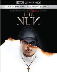 The Nun does nothing for Catholic recruiting on 4K UHD courtesy of Warner Bros. Home Entertainment. The film has been letterboxed at 2.35:1 and the Disc contains an HEVC 2160p transfer which runs at an average of 70 Mbps. The image is sharp and clear, showing no overt grain and no defects from the source materials. When the film played in theaters, I'd seen some comments that it was a dark movie and that's certainly true. There are times here where it teeters on reaching a point where the action is not visible, but it's never overly dark. Still, I would recommend watching it with the lights off. Outside of that, the transfer brings us nice detail and depth. The Disc carries a Dolby Atmos audio track which runs at 48 kHz and an average of 4.5 Mbps. The track provides clear dialogue and sound effects. The surround and stereo effects are very strong here, as they feed off of the film's claustrophobic feel. As the characters move through the abbey, we get sounds coming from off-screen oozing through the front and rear channels, with some being very nicely detailed. The subwoofer joins the fray during the "shock" and action sequences.